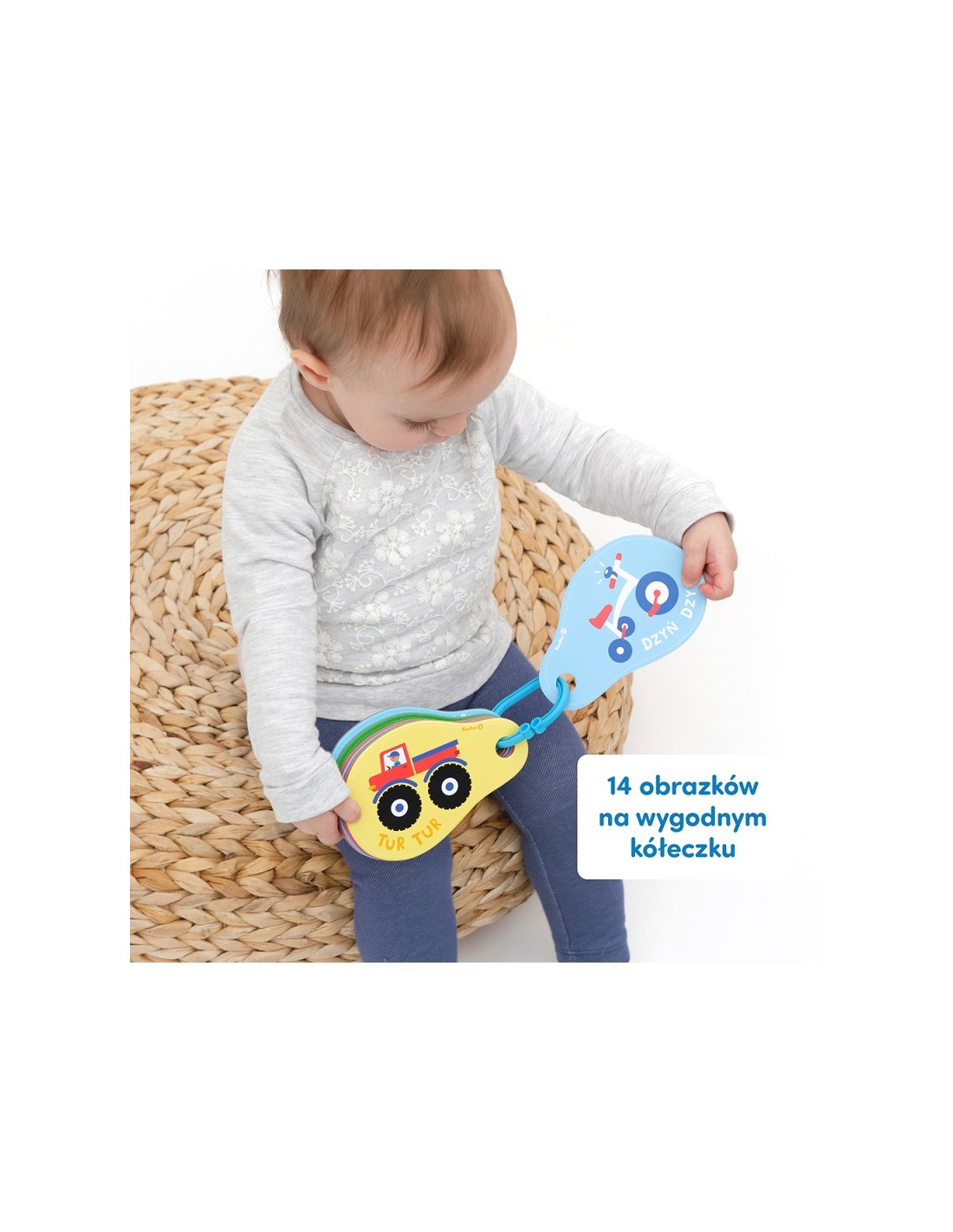 Pierwsza książeczka obrazkowa na kółeczku zachęca do wspólnego poznawania świata i różnorodnych rozwijających zabaw. Kolorowe ilustracje z pojazdami o liczbie szczegółów dopasowanej do wieku, zachęcają dzieci do pokazywania paluszkiem, poznawania nowych słów i podejmowania prób mówienia. Czytajcie ją razem – to doskonały sposób na spędzanie czasu. Poręczny format sprawia, że możecie ją zawsze mieć przy sobie. Praktyczne kółeczko umożliwia zawieszenie jej przy wózku lub korzystanie z pojedynczych kart.
