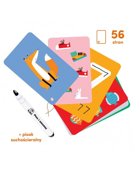 Edukacyjny zestaw zawiera książeczkę z ciekawymi zadaniami i magiczny pisak. Kolorowe, pełne humoru i zabawnych detali ilustracje inspirują dzieci do twórczych zabaw oraz podejmowania pierwszych prób pisania i liczenia. Karty pozwalają na wielokrotne rysowanie i zmazywanie. Do zestawu dołączyliśmy poradnik dla rodziców z pomysłami na zabawy i informacjami o rozwoju grafomotorycznym dzieci. Zestaw to doskonały pomysł na edukacyjny prezent dla przedszkolaka. Znakomicie sprawdza się w podróży z dzieckiem.