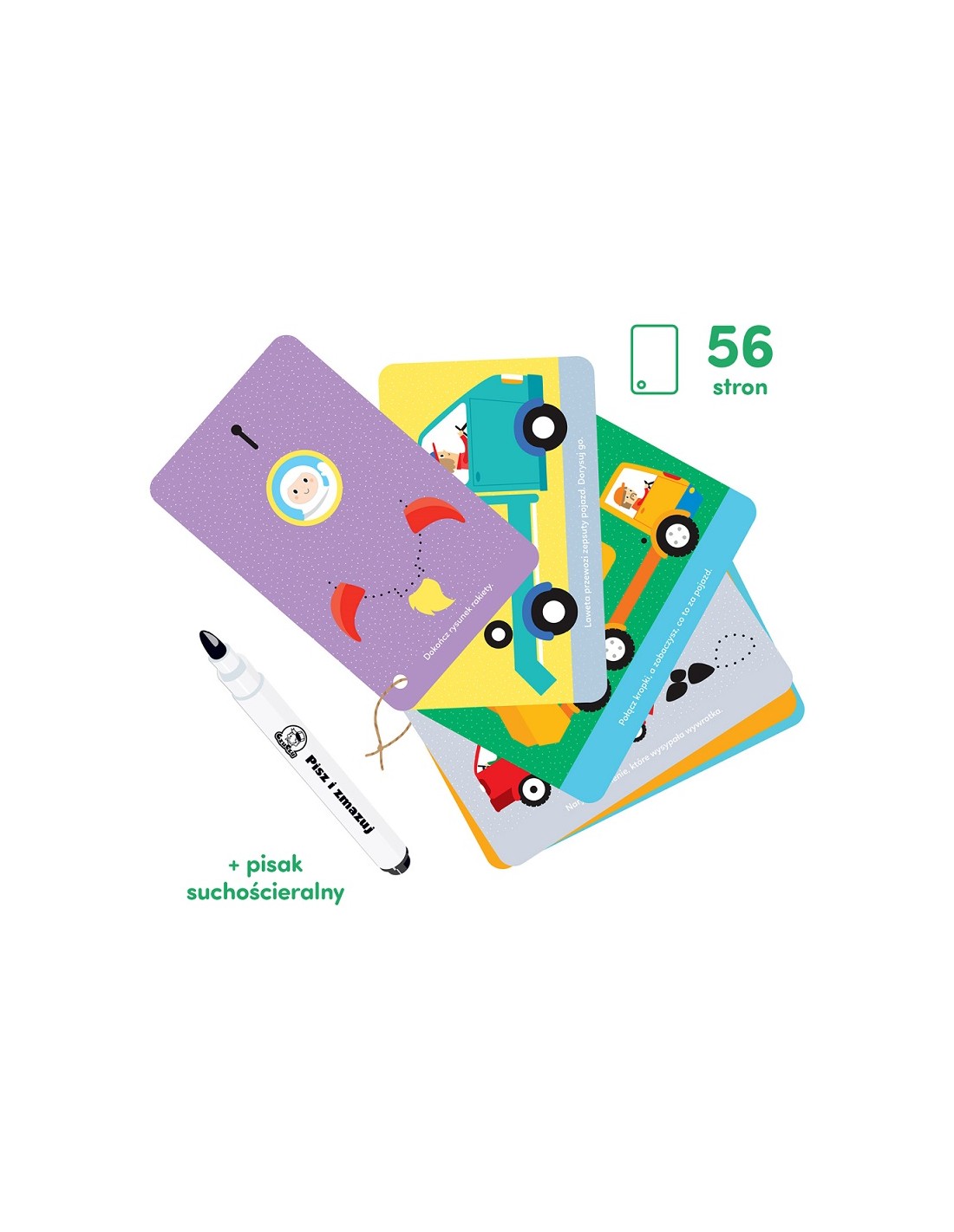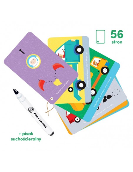 Edukacyjny zestaw składa się z książeczki pełnej pomysłowych zadań i magicznego pisaka. Barwne ilustracje przedstawiające przeróżne pojazdy inspirują dzieci do kreatywnych zabaw. Karty pozwalają na wielokrotne rysowanie i zmazywanie. W zestawie znajdziecie poradnik dla rodziców z pomysłami na zabawy i informacjami o rozwoju grafomotorycznym dzieci. To świetny pomysł na edukacyjny i kreatywny prezent dla przedszkolaka. Doskonale sprawdza się w podróży z dzieckiem.