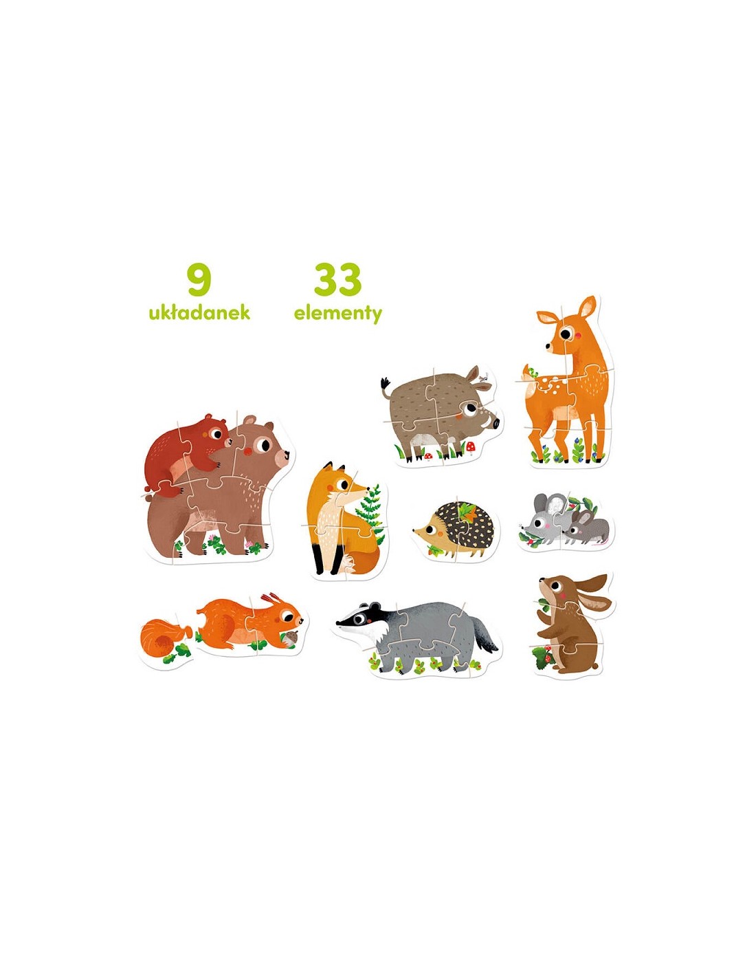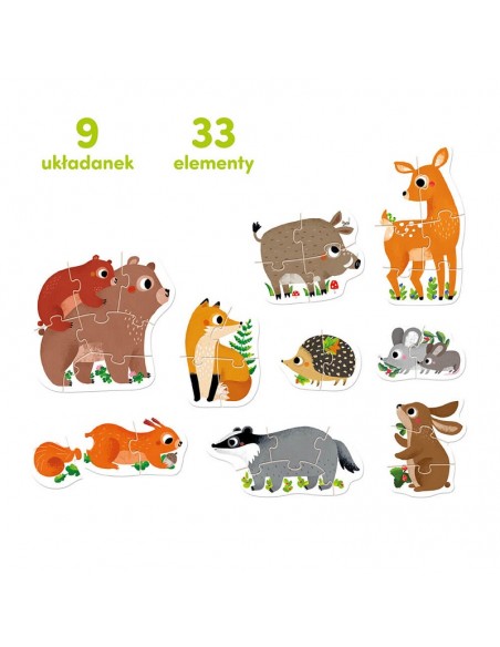 W poręcznym pudełku zamieszkało mnóstwo leśnych zwierzaków: od małych myszek po niedźwiadki. 9 układanek ma różną liczbę elementów: 2, 3, 4, 5 i 6. W ich rozdzieleniu pomogą różne kolory tła na rewersach. Dzieci mogą stopniowo doskonalić sztukę układania coraz trudniejszych puzzli. Piękne ilustracje, duże elementy i forma produktu sprawiają, że zestaw doskonale sprawdzi się jako pierwsze wieloelementowe puzzle dla dzieci.