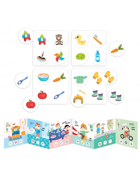 Edukacyjny zestaw zawiera książeczkę oraz pierwszą, prostą grę dla maluszków. Porusza tematykę znaną dzieciom: ilustracje z sympatycznymi bohaterami przedstawiają sytuacje i przedmioty znane dzieciom z najbliższego otoczenia. Bawcie się na różne sposoby. Poziom trudności zabawy możecie łatwo dostosować do umiejętności dziecka. W zestawie znajdziecie poradnik pełen pomysłów na wspólne zajęcia. Czytajcie i bawcie się razem!