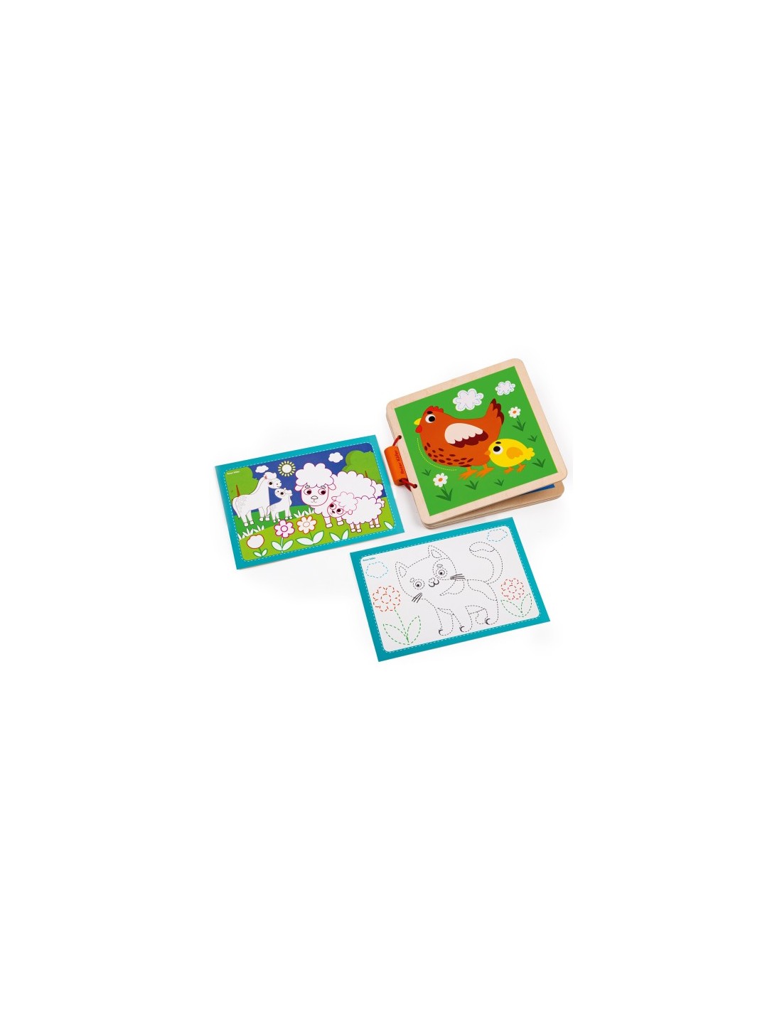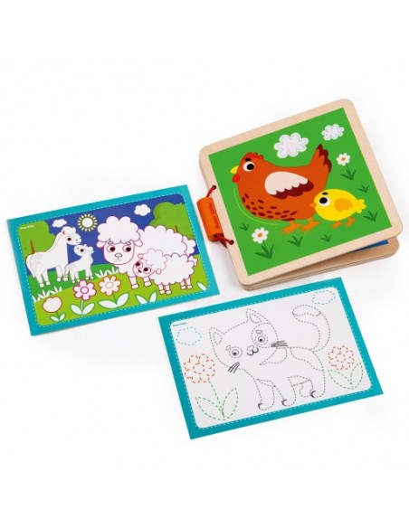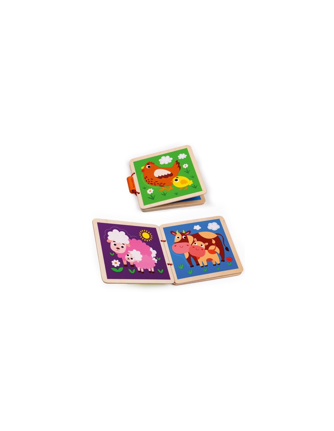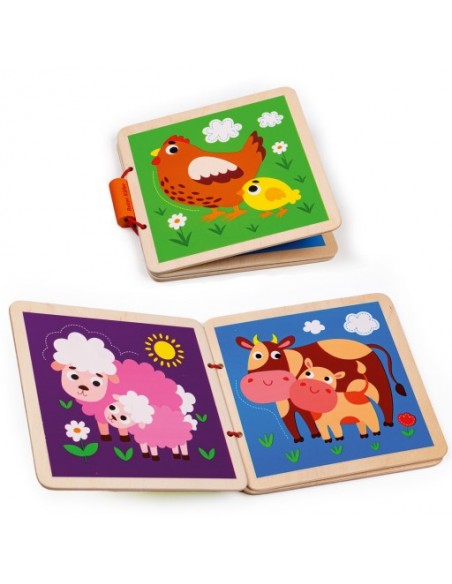 Książka została wykonana z naturalnego drewna. Powierzchnia jest doskonale wypolerowana. Książeczka zapinana jest na gumkę z drewnianym elementem. Obrazki są wykonane bezpiecznymi farbami. Z troską o najmniejszych!